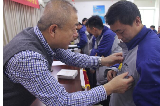 副经理耿延洪(左)为优秀员工悬挂“优秀员工”胸牌